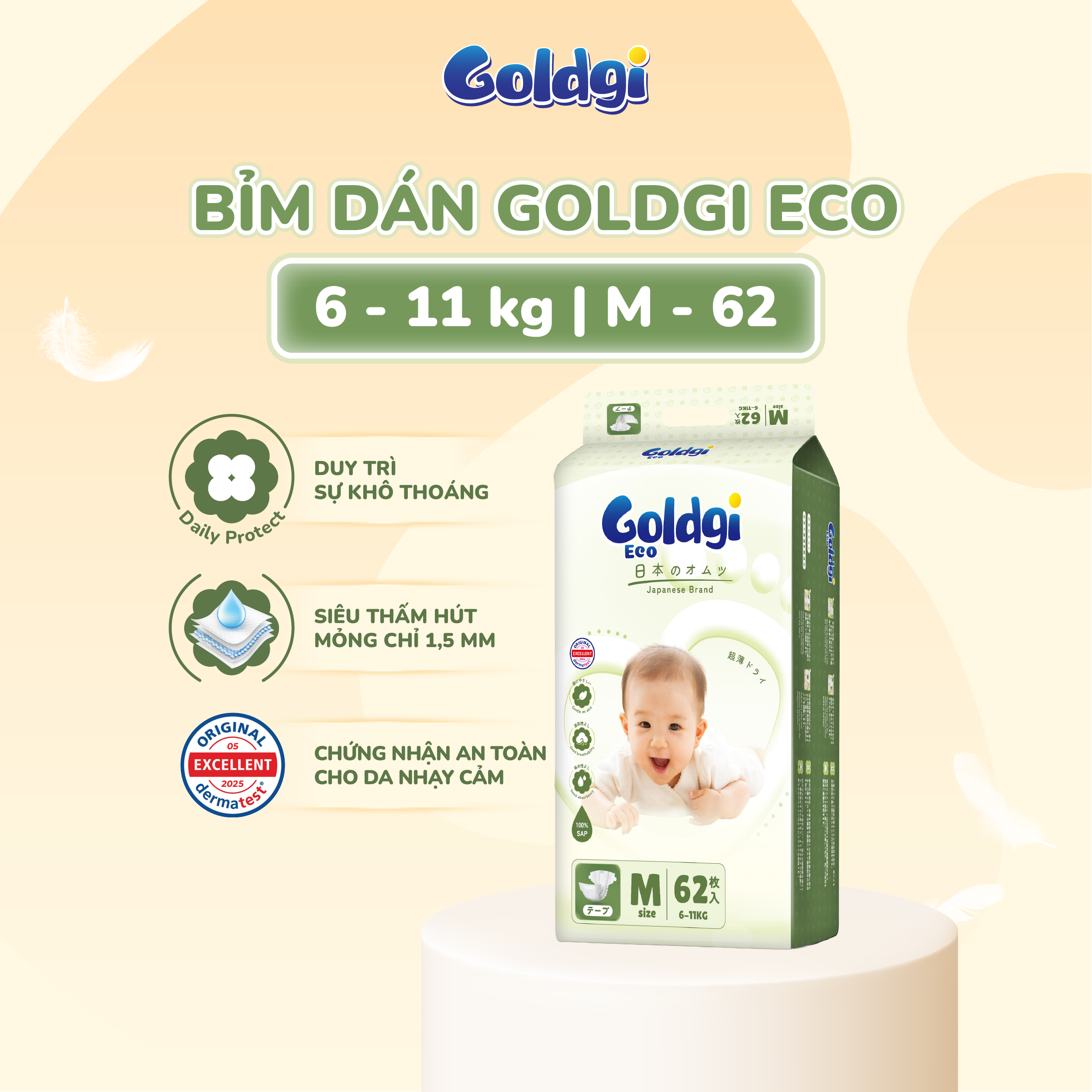 Goldgi Eco là dòng bỉm được phát triển dành riêng cho nhu cầu sử dụng hằng ngày của bé, với định hướng thân thiện – an toàn – tiết kiệm thông minh cho cha mẹ. Sản phẩm tiên phong trong phân khúc “bỉm hàng ngày”, đáp ứng đầy đủ các tiêu chí cơ bản nhưng thiết yếu: bảo vệ da bé ổn định mỗi ngày và tối ưu chi phí chăm sóc lâu dài cho gia đình.