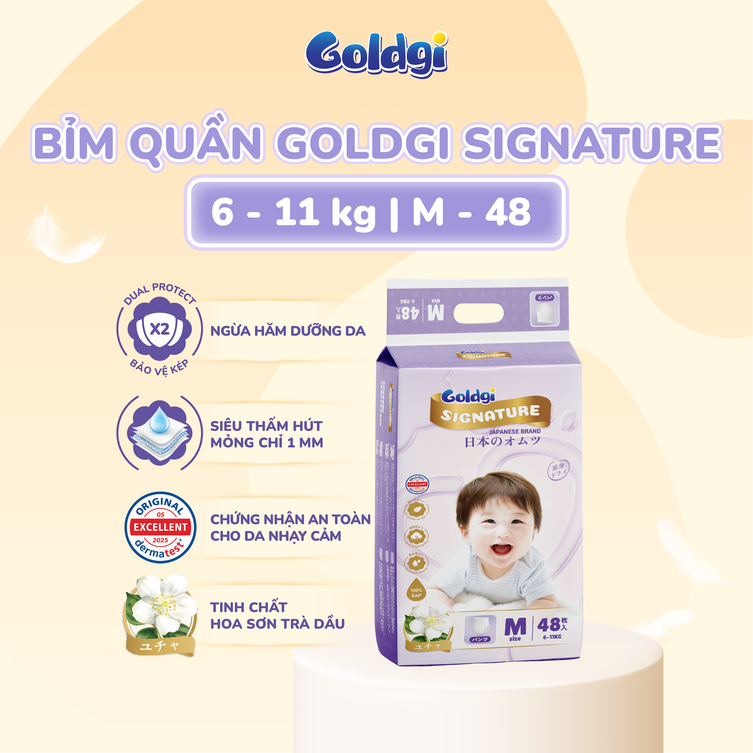 GOLDGI SIGNATURE là dòng tã cao cấp, tiên phong trong hành trình chăm sóc làn da nhạy cảm của bé ngay từ những năm tháng đầu đời. Sản phẩm được nghiên cứu và phát triển với triết lý “dịu êm là chuẩn mực”, GOLDGI SIGNATURE mang đến giải pháp bảo vệ da toàn diện, an toàn và tinh tế cho bé yêu.